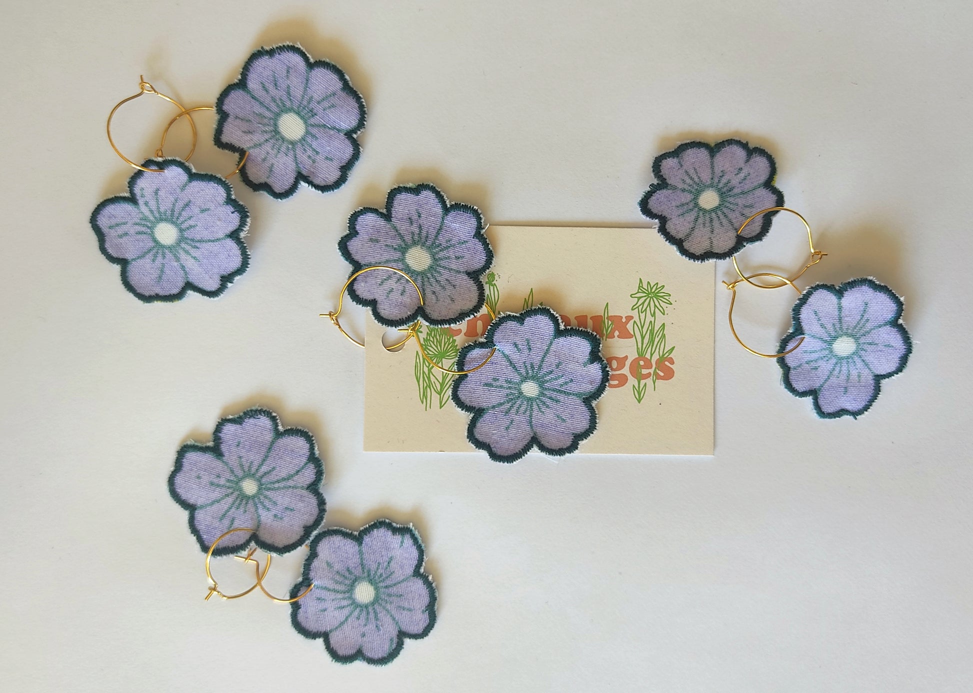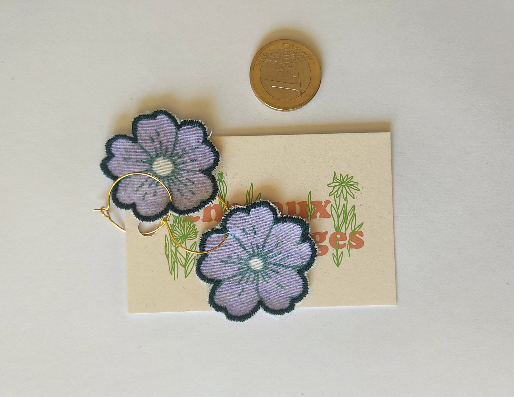 Appliques textiles fabriquées par mes soins en mini série, et montées en boucles d’oreilles sur des créoles garanties sans cadmium ni nickel.