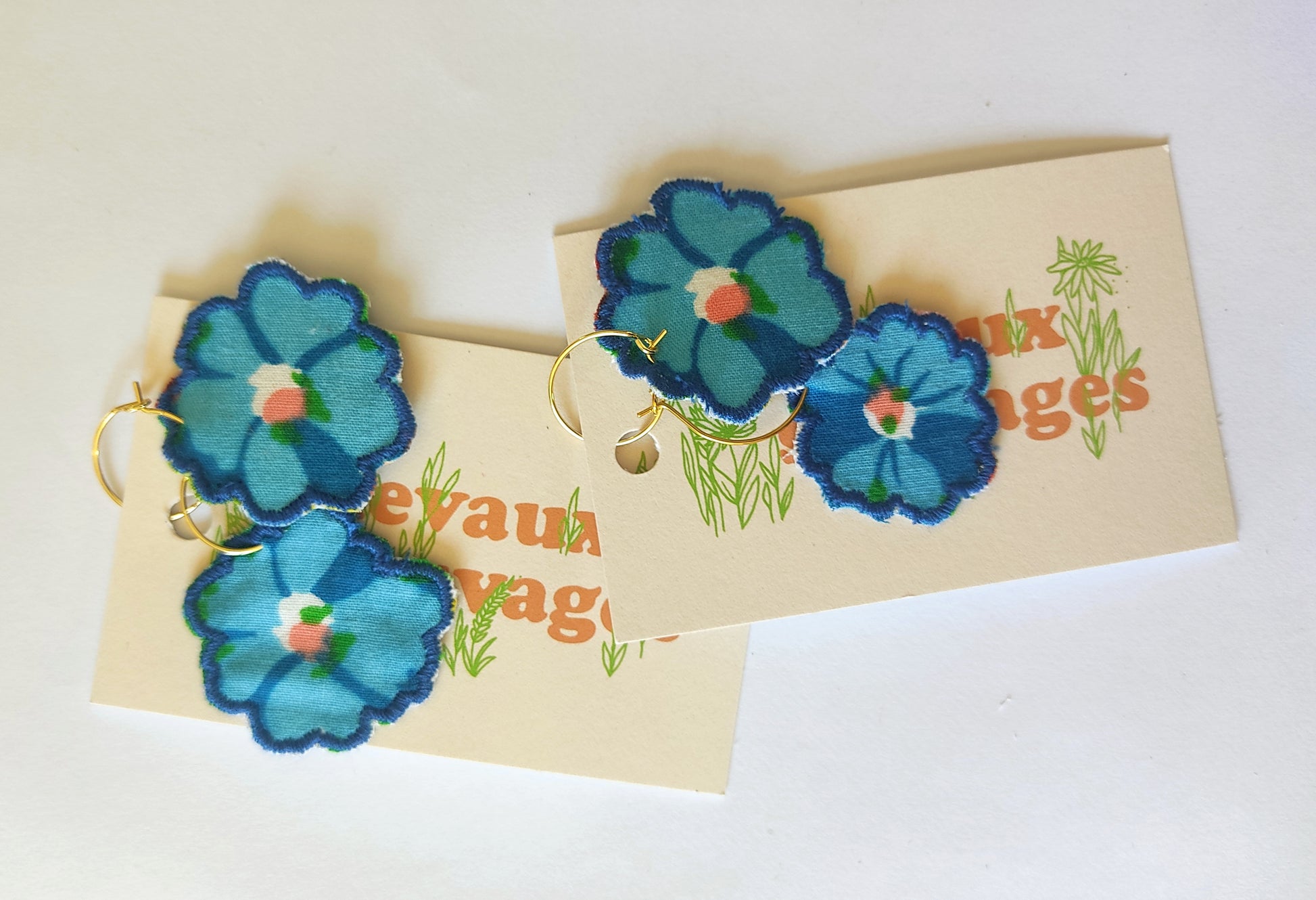 Appliques textiles fabriquées par mes soins en mini série, et montées en boucles d’oreilles sur des créoles garanties sans cadmium ni nickel.