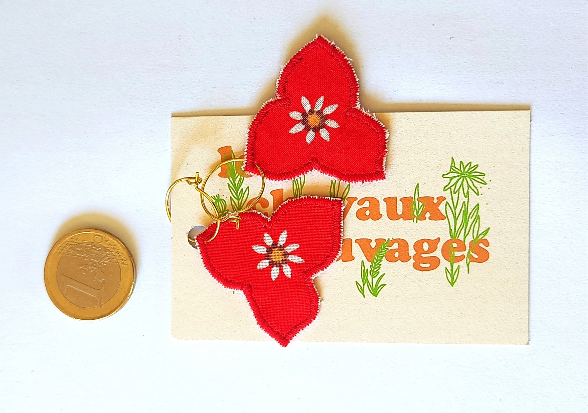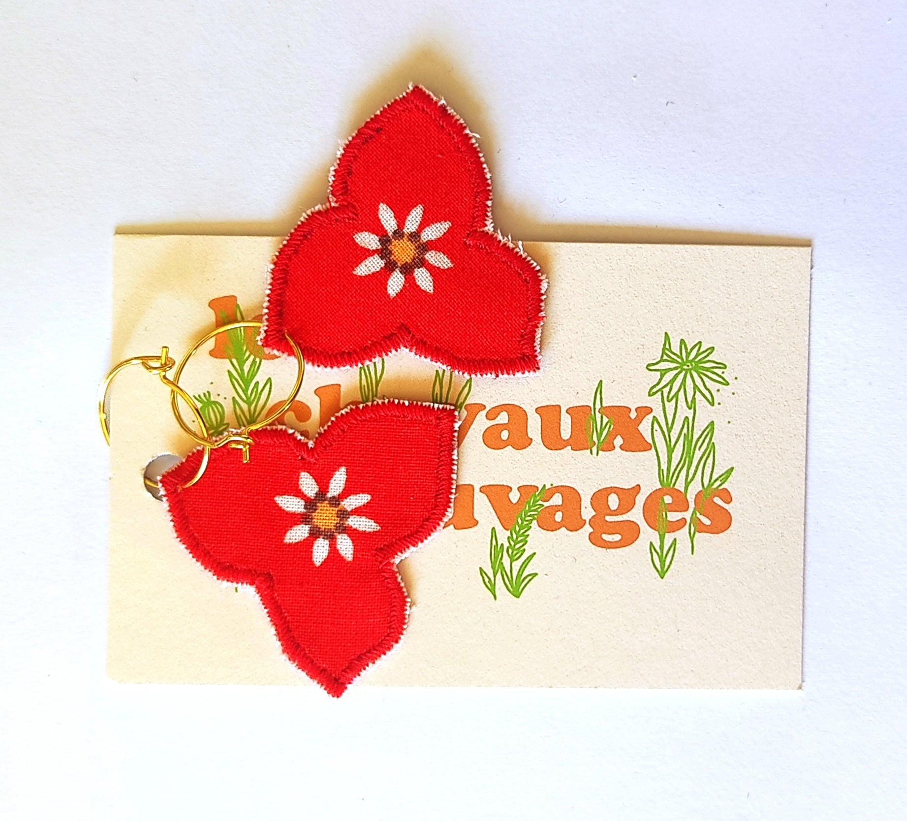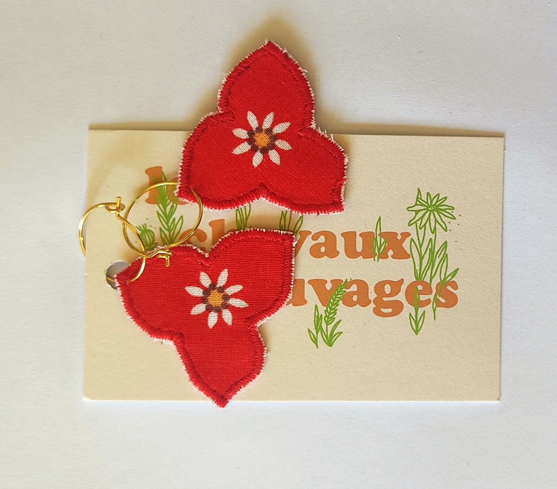Appliques textiles fabriquées par mes soins en mini série, et montées en boucles d’oreilles sur des créoles garanties sans cadmium ni nickel.