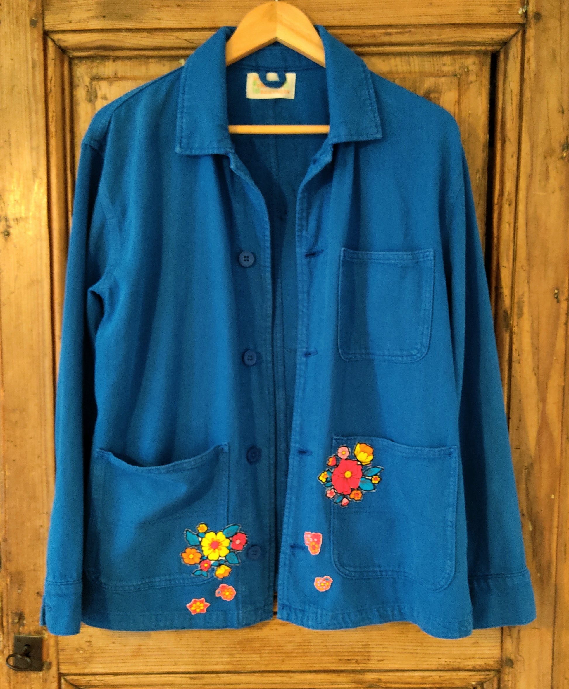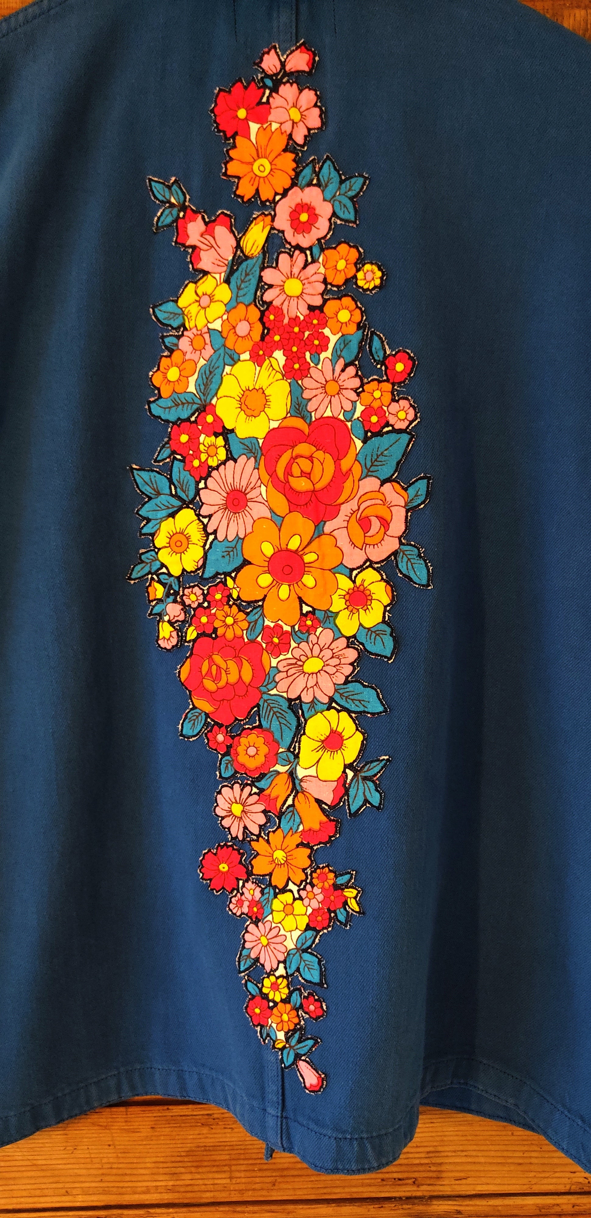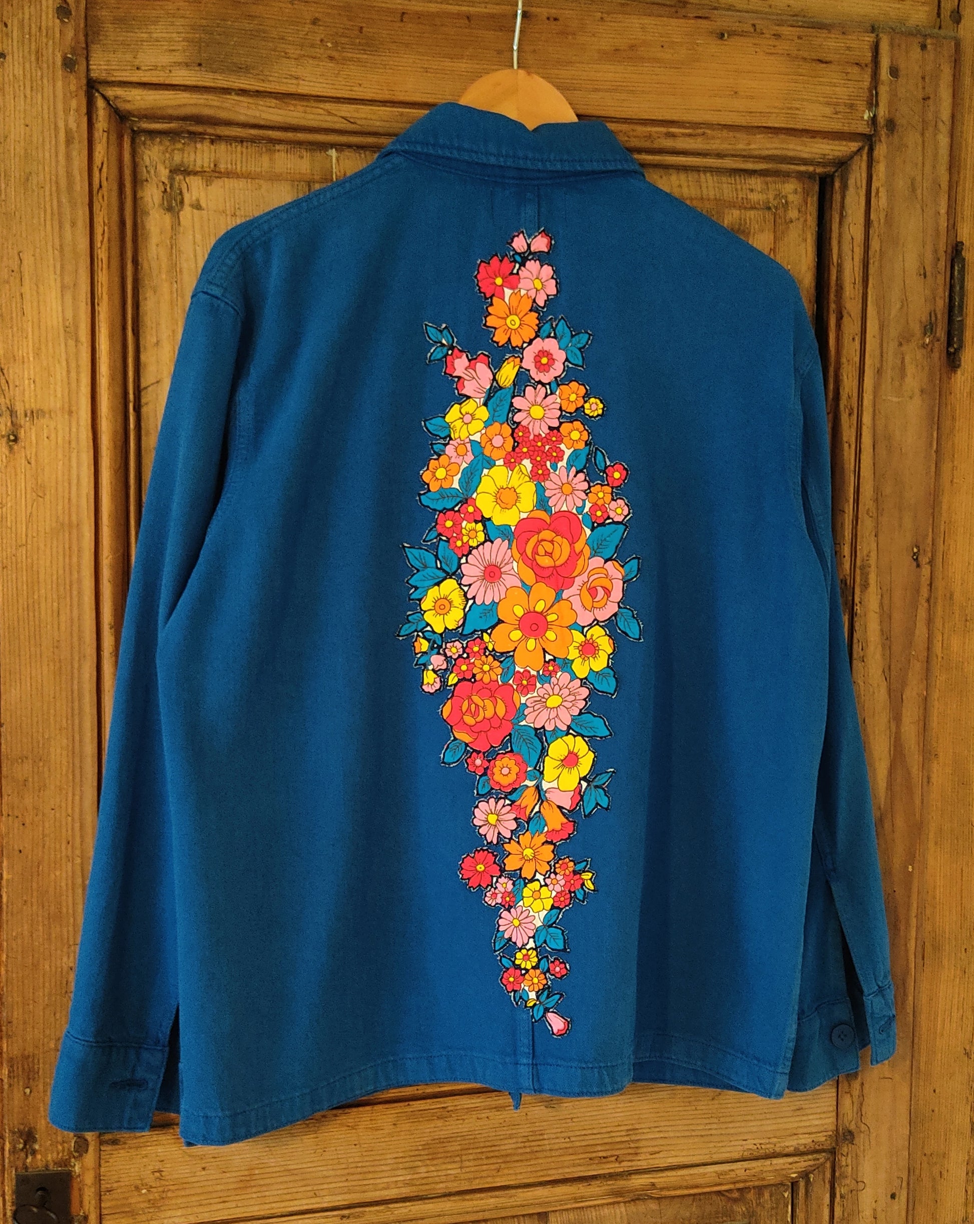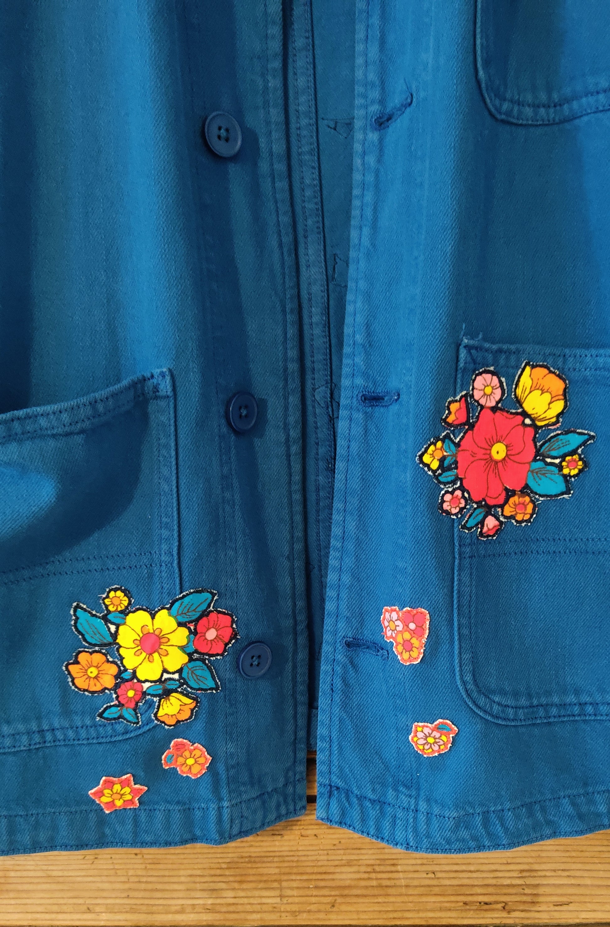 Veste bleu de travail de seconde main, (100% coton), bleue, habillée d'une énorme applique de fleurs multicolores, fabriquée par mes soins et issue d'un torchon vintage des années 70.