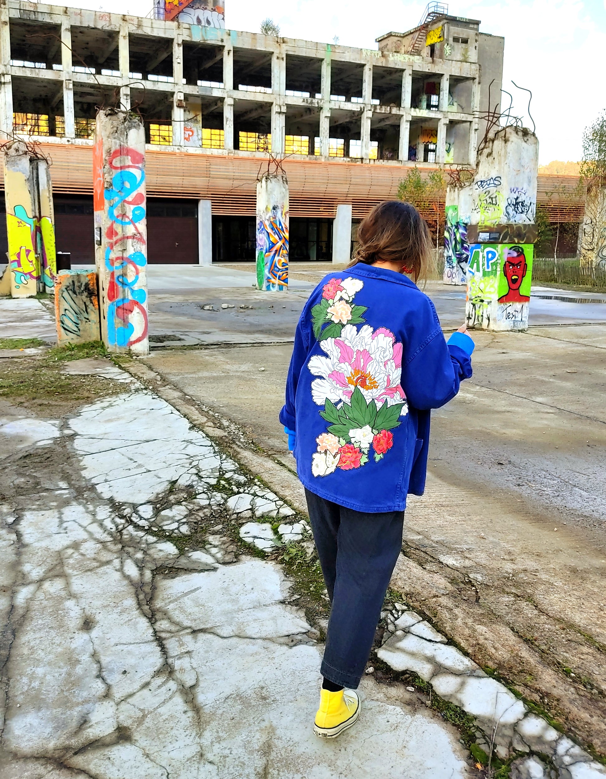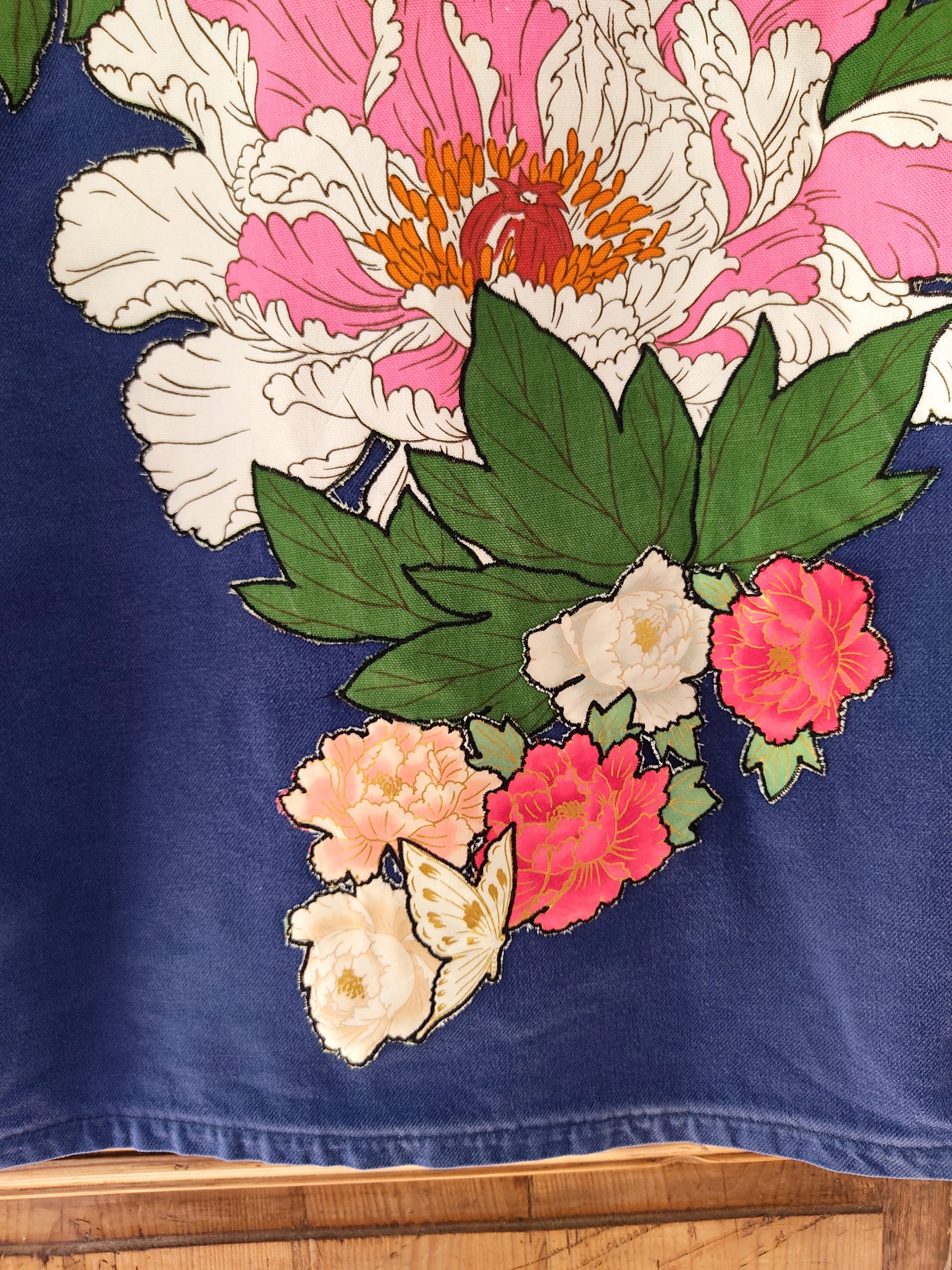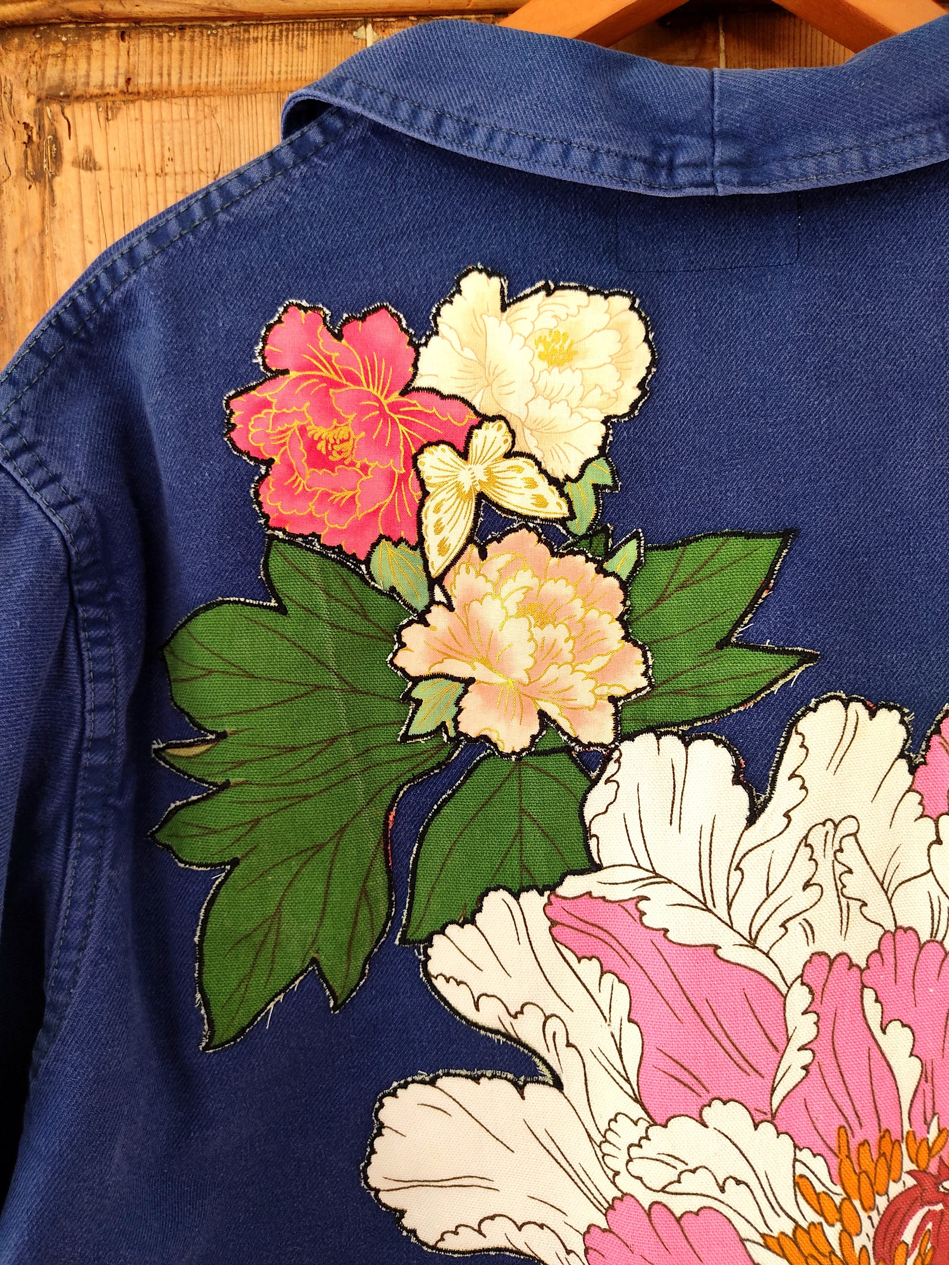 Veste bleu de travail de seconde main, (100% coton), bleue, habillée d'une énorme applique de fleur rose et blanche et entourée de roses du même ton et dorées.