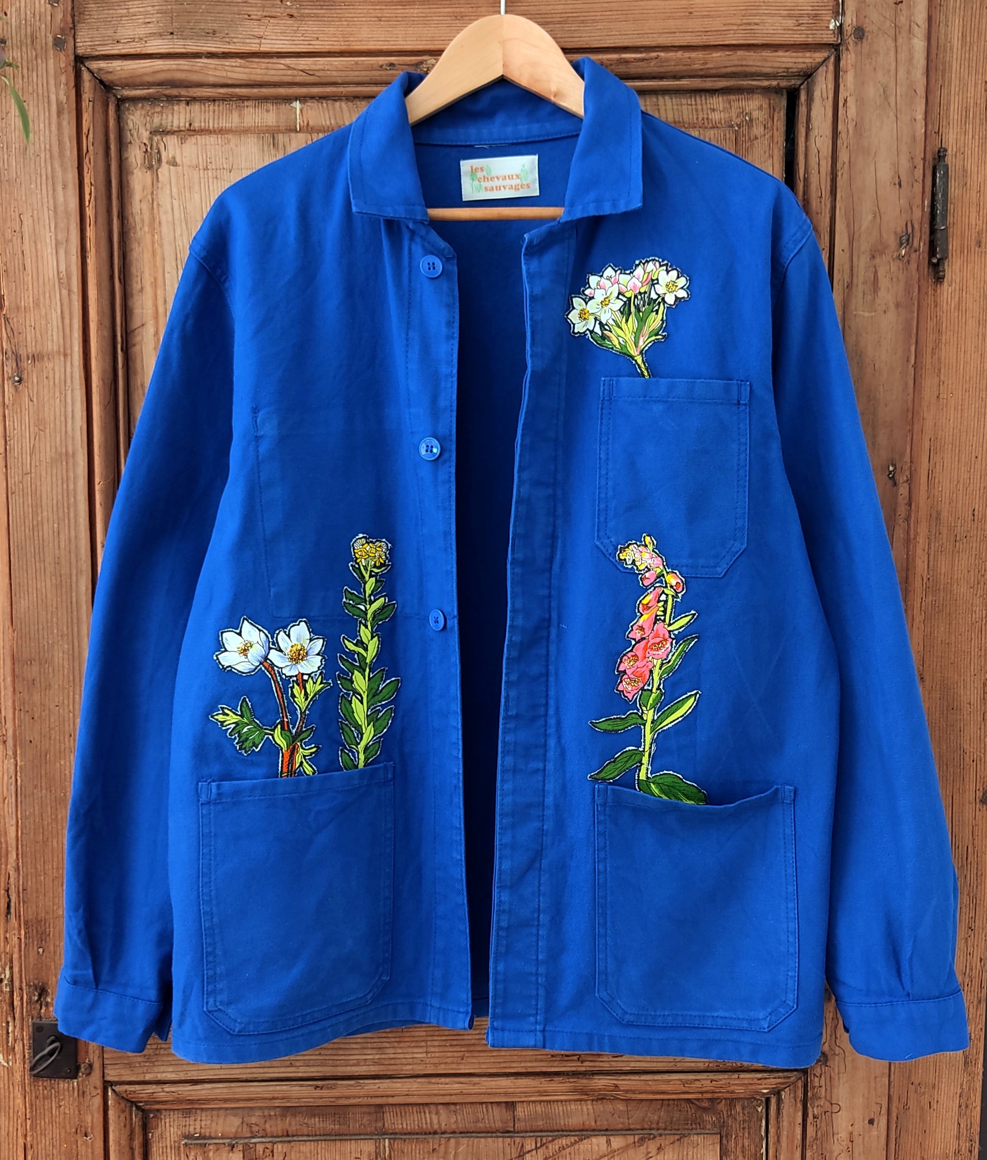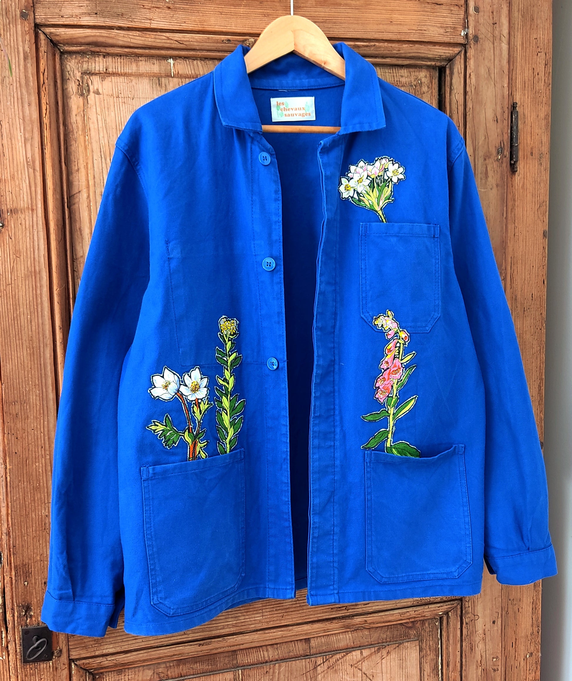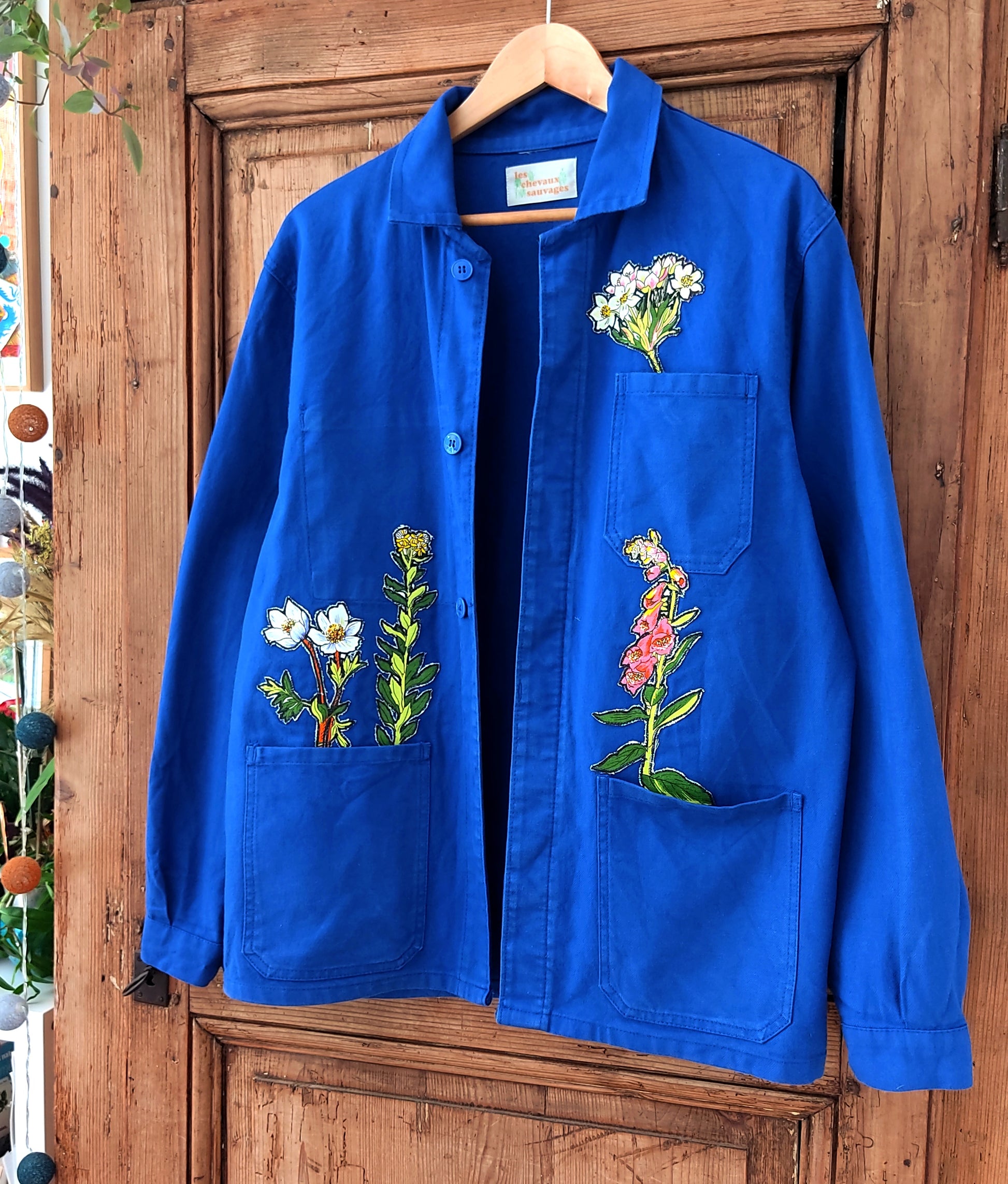 Veste bleu de travail de seconde main, (100% coton), bleue, habillée d'appliques de fleurs fabriquées par mes soins et issues d'un torchon vintage des années 80.