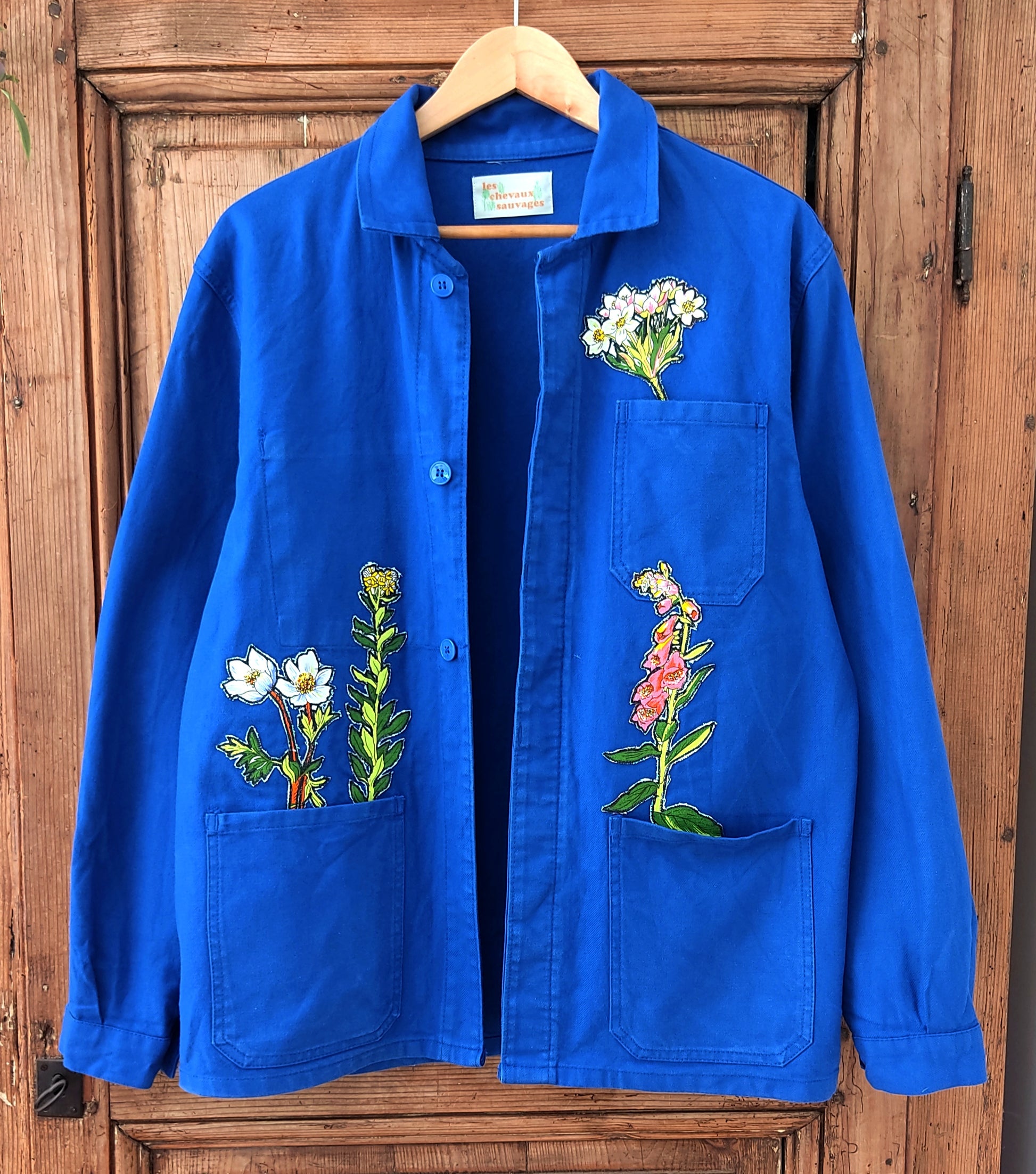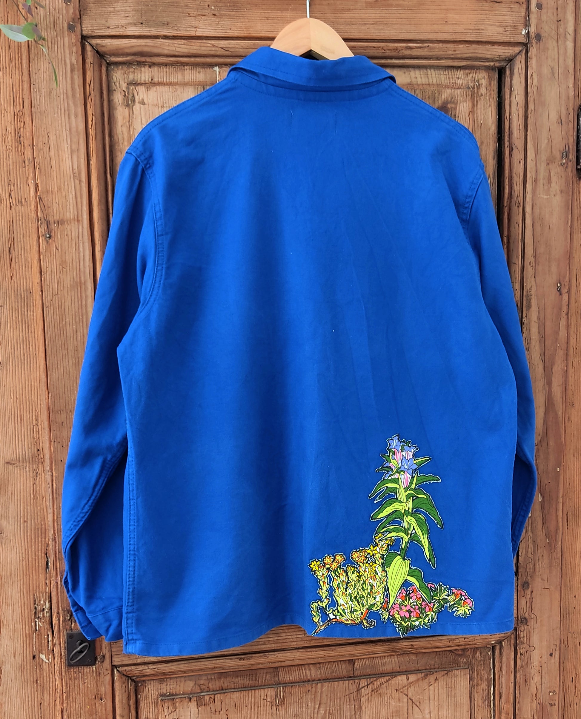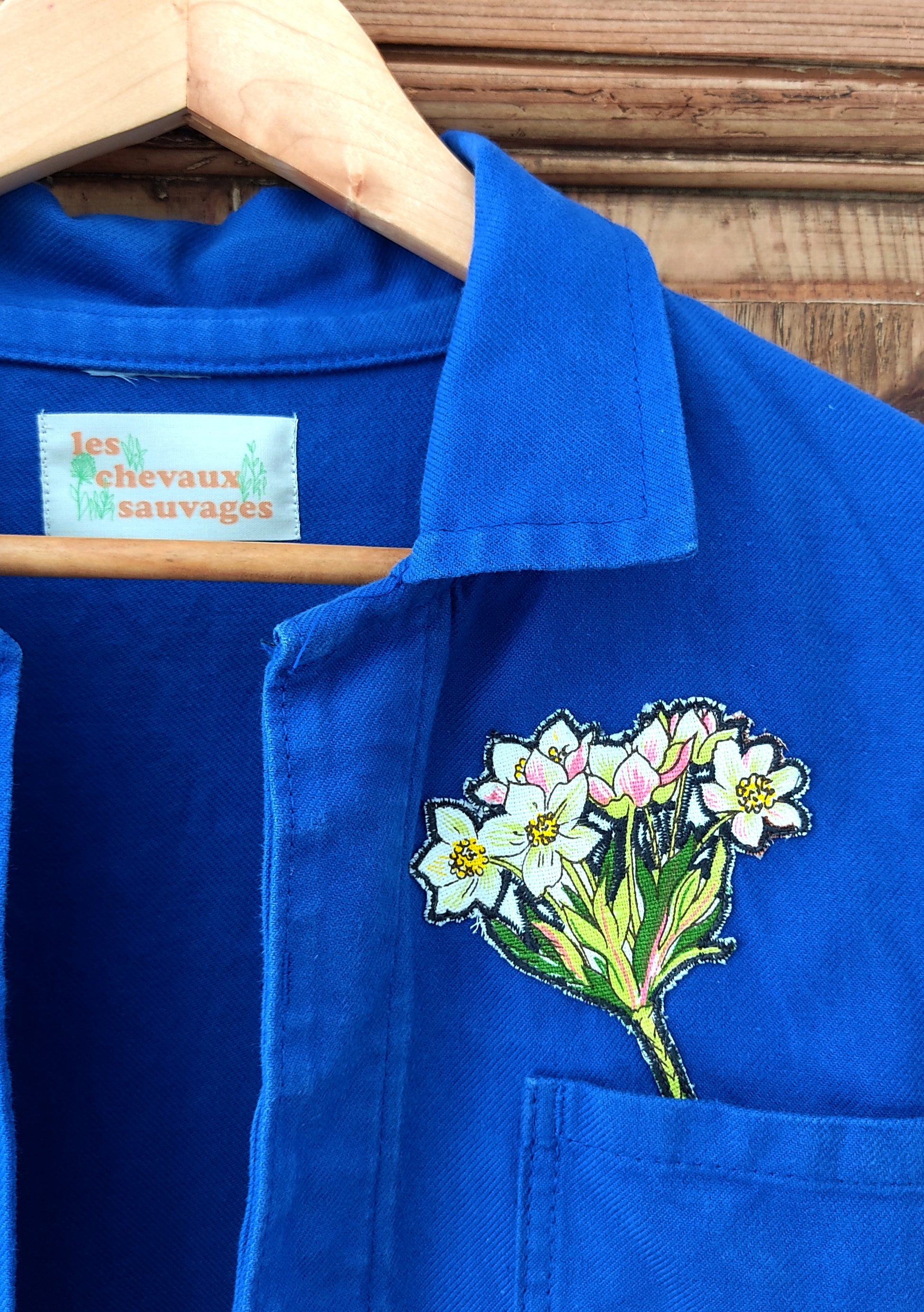 Veste bleu de travail de seconde main, (100% coton), bleue, habillée d'appliques de fleurs fabriquées par mes soins et issues d'un torchon vintage des années 80.