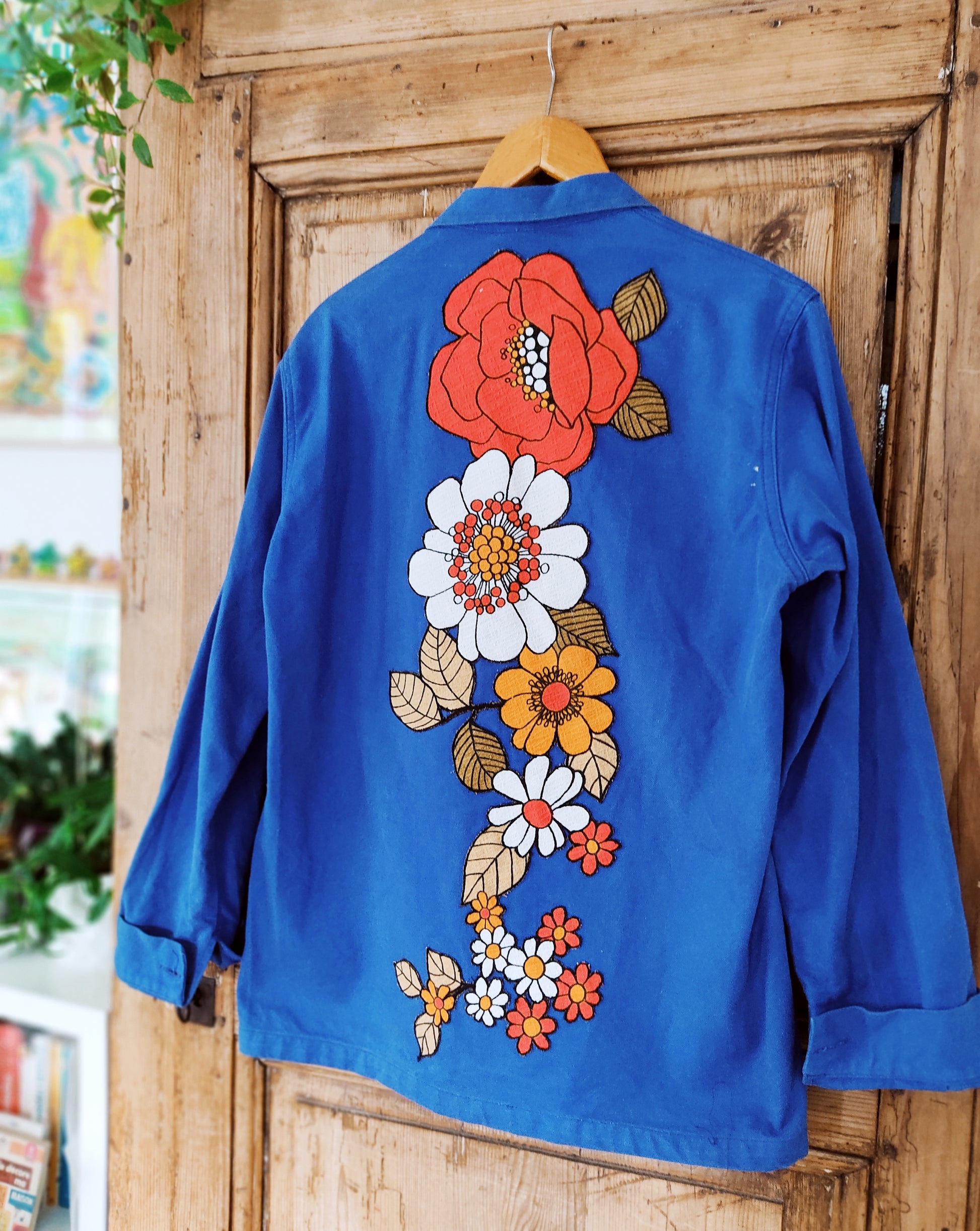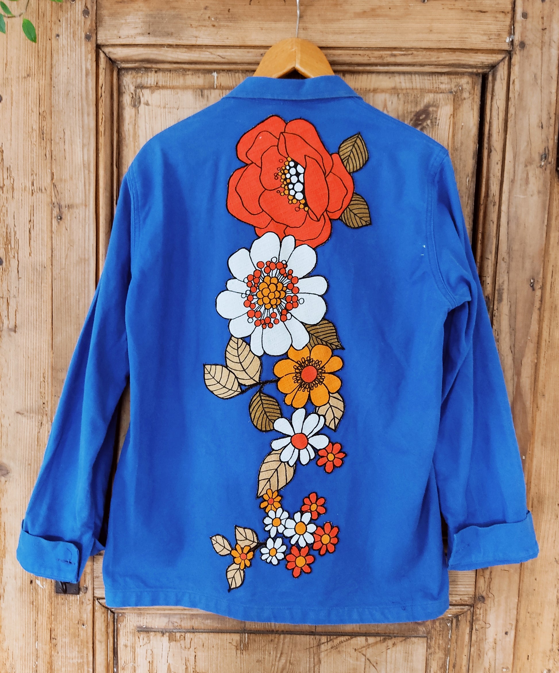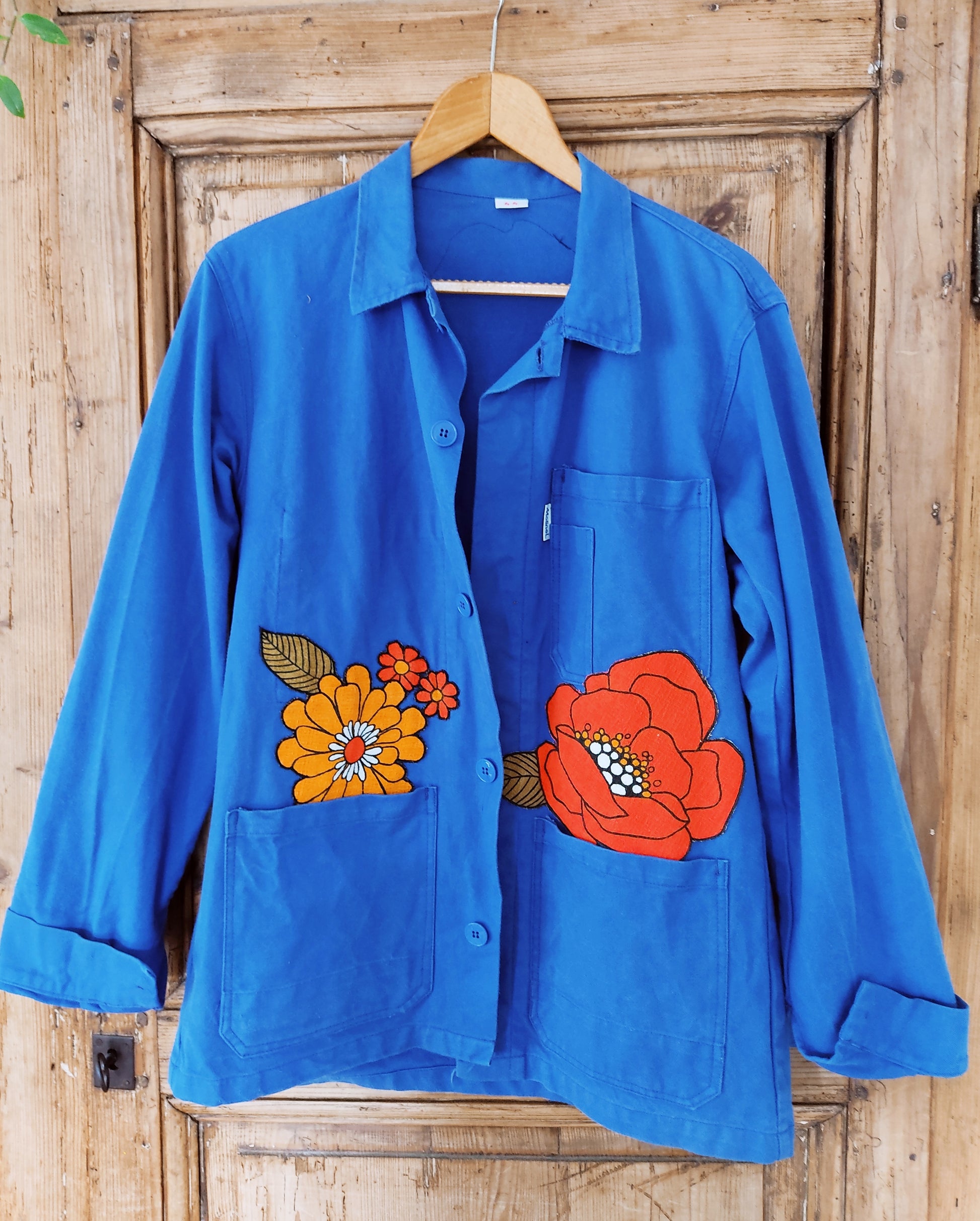 Veste bleu de travail de seconde main, (100% coton), bleue, habillée d'appliques de fleurs super seventies et issues d'un tissu d’ameublement vintage des années 70.