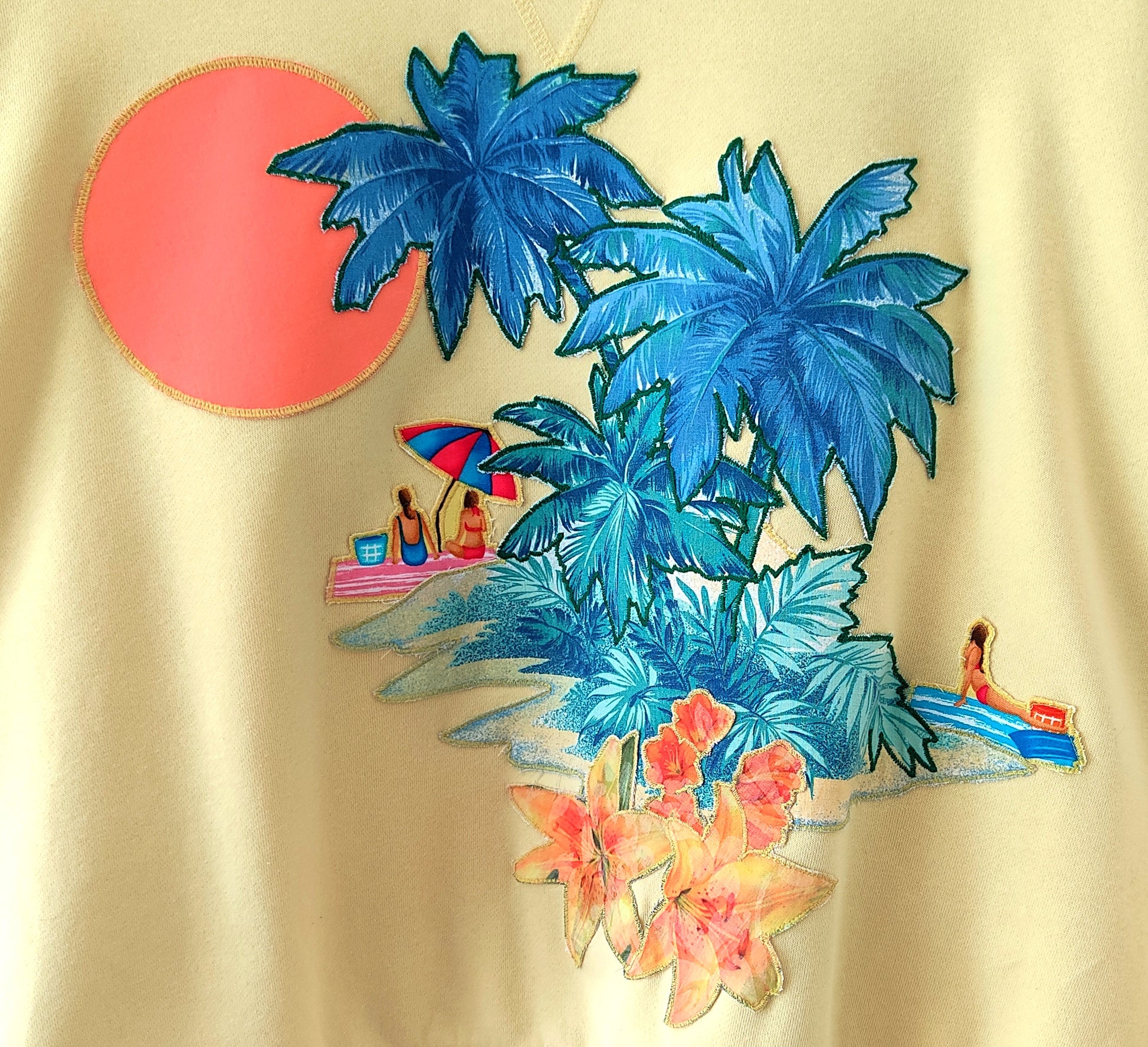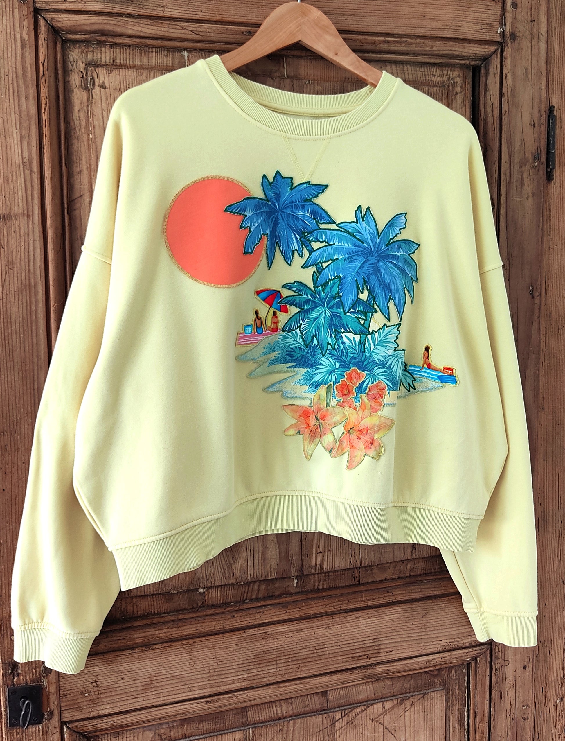 Sweat de seconde main, (70% coton et 30%polyester), jaune pâle, habillé de palmiers bleus, d'un soleil et de plagistes.