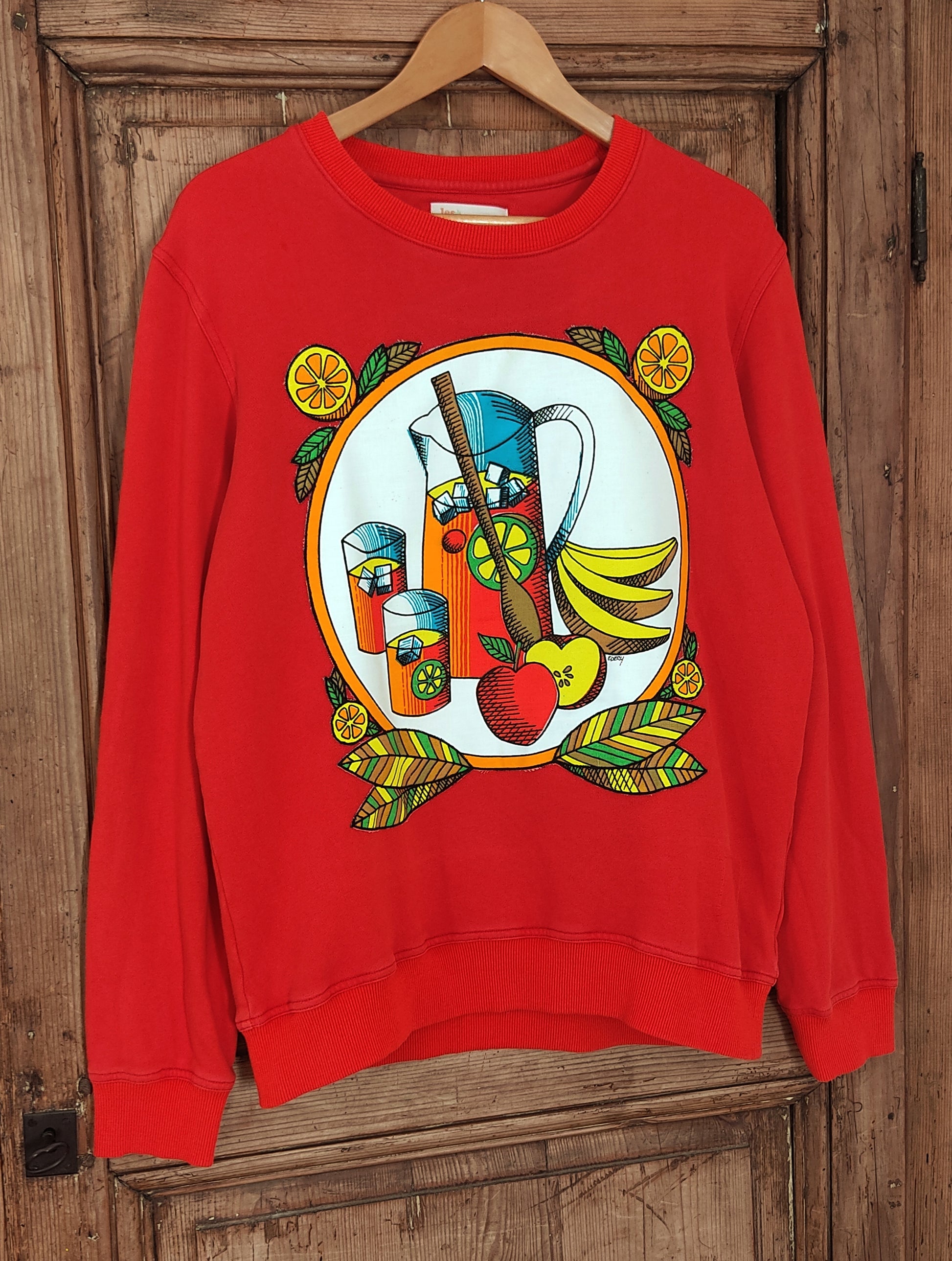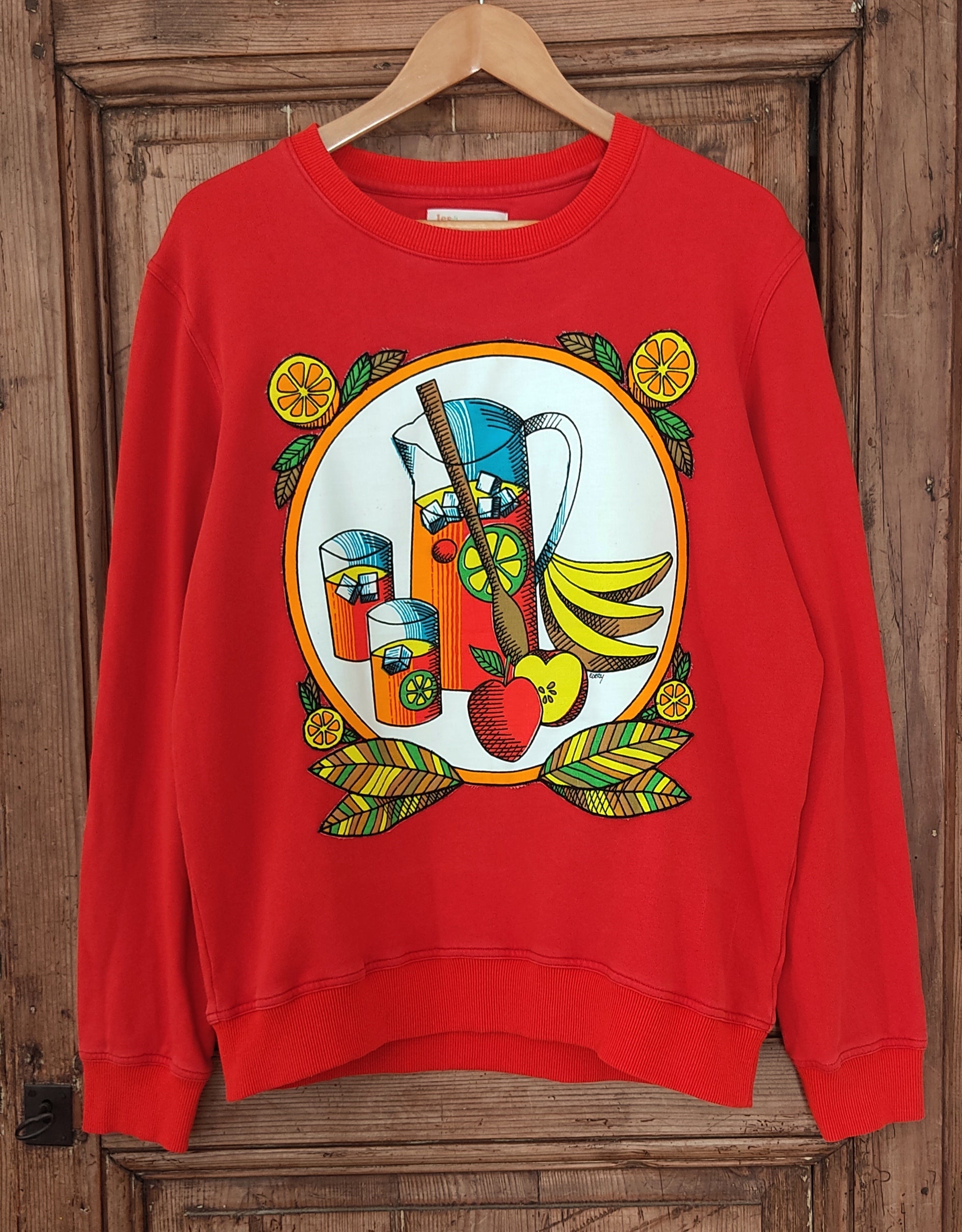 Sweat de seconde main, (70% coton et 30%polyester), orange, habillé d'une applique représentant un cocktail de fruit et issue d'un torchon vintage des années 80, imprimé de la recette de la sangria.