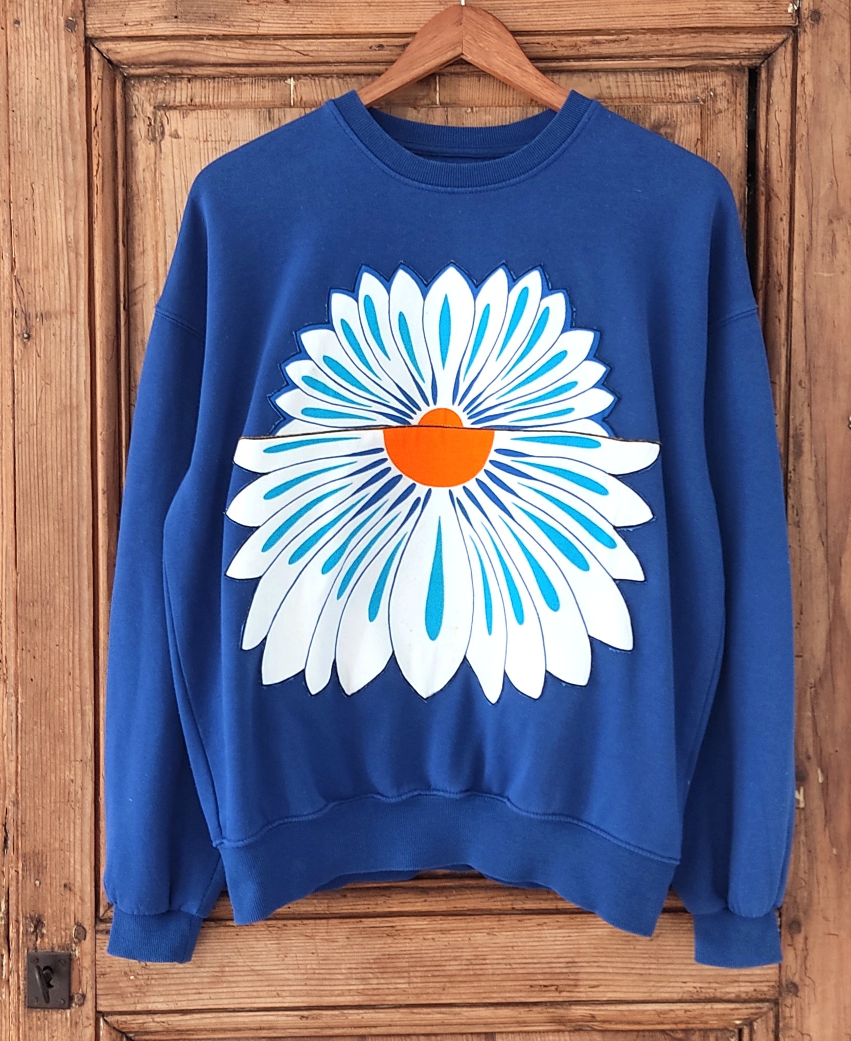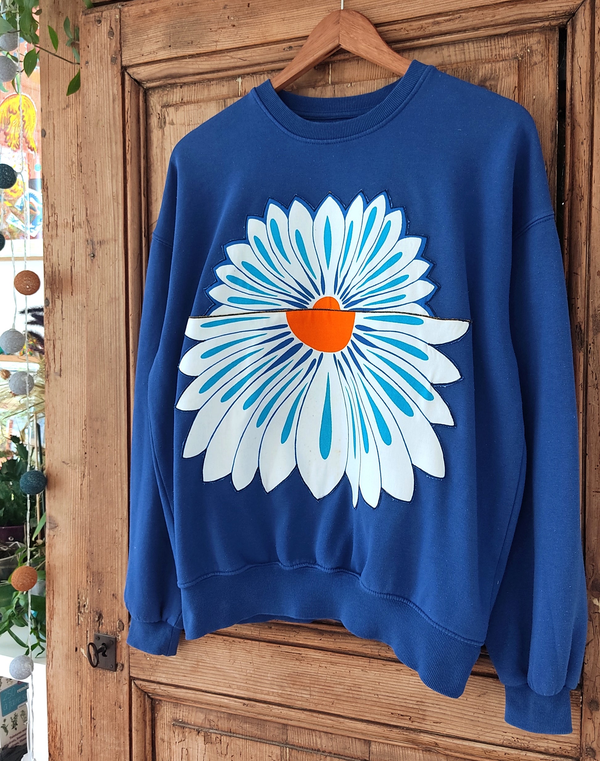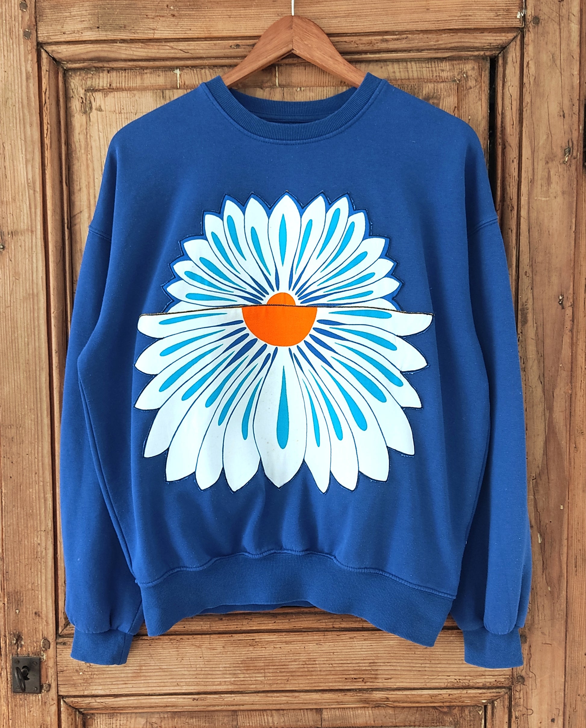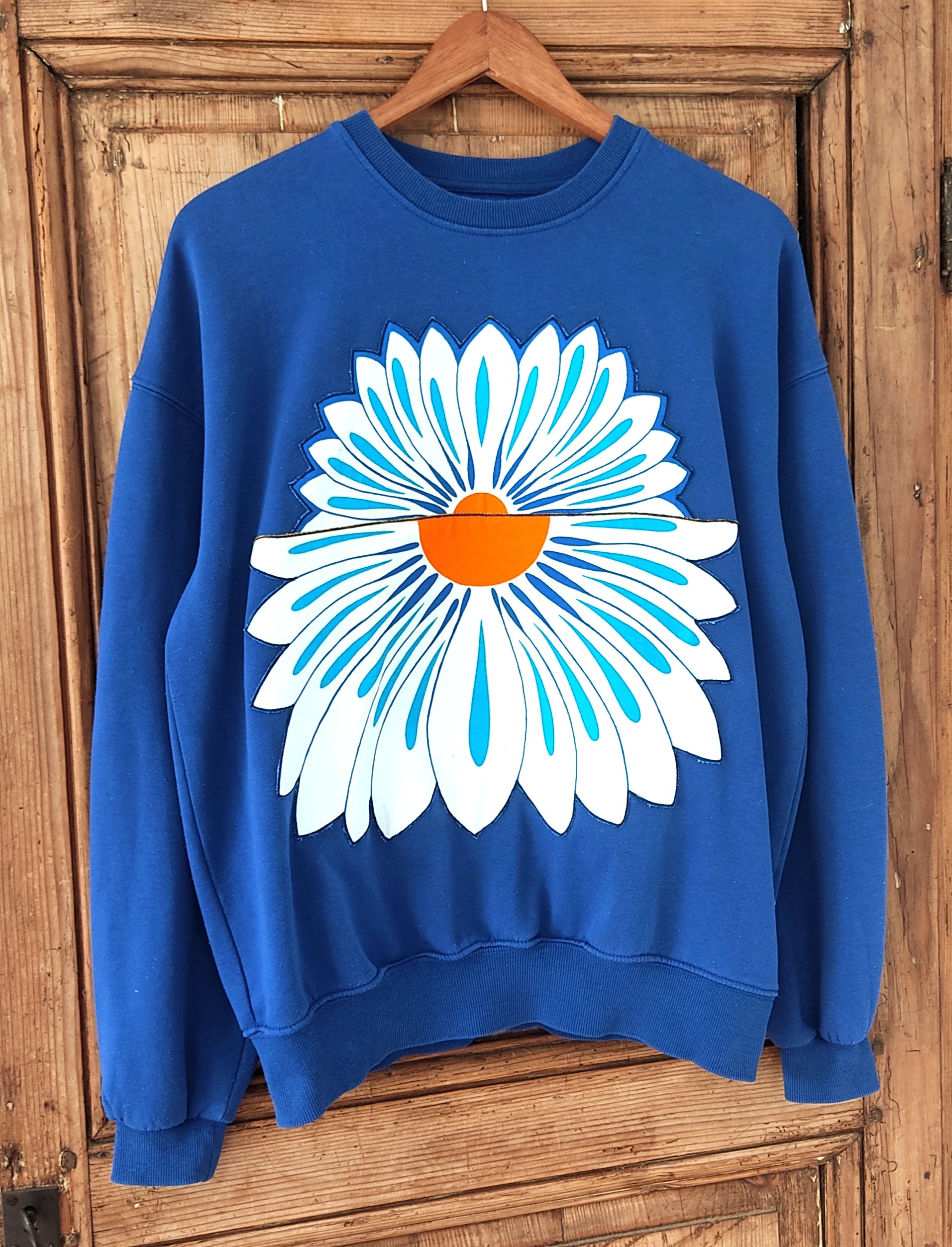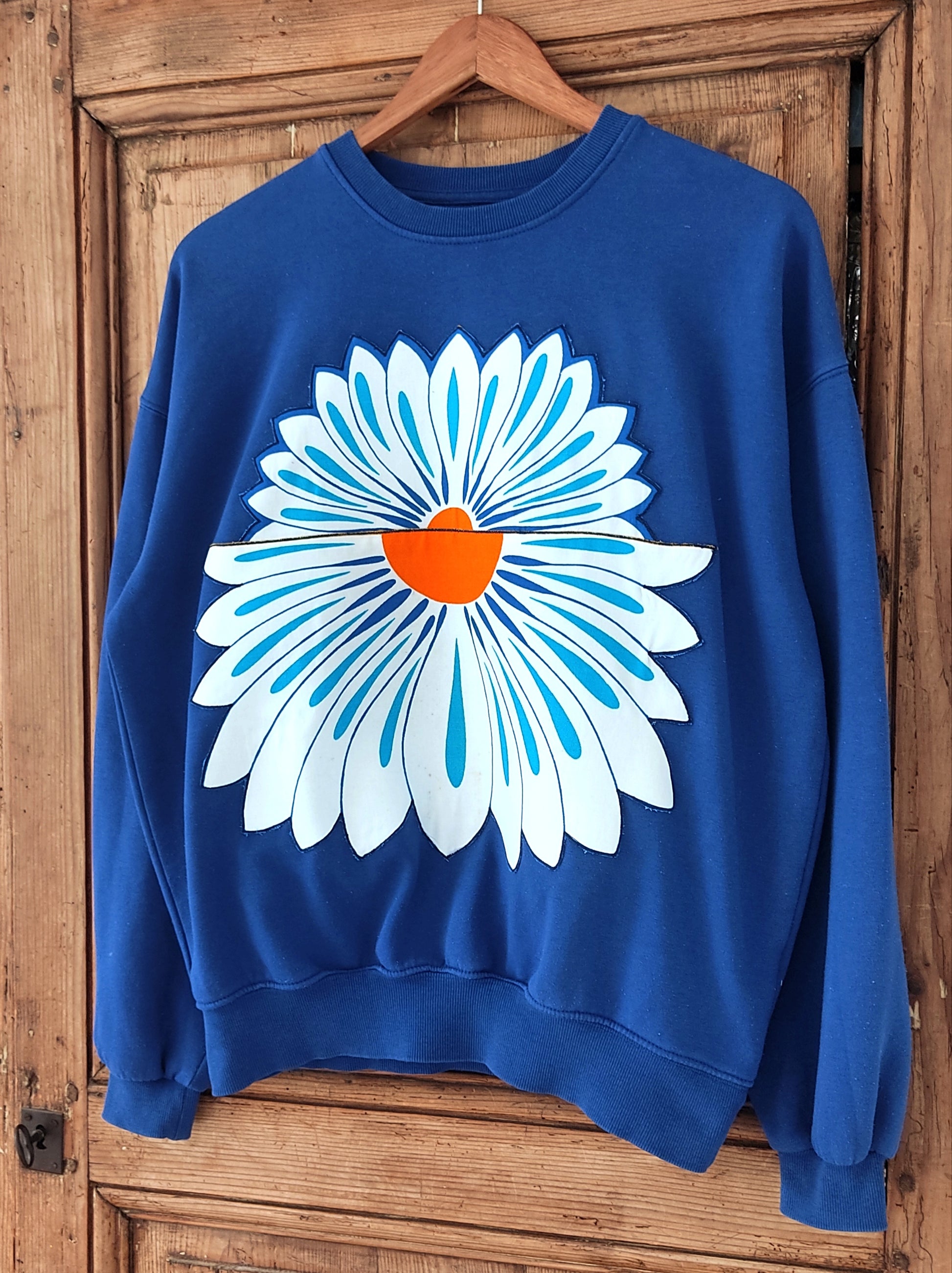 Sweat de seconde main, (70% coton et 30%polyester), bleu, habillé d’énormes appliques de demi-marguerites fabriquées par mes soins et issues d'un superbe torchon vintage des années 70.